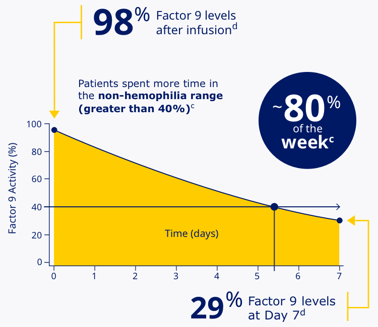 Rebinyn® once-weekly helped previously treated adults spend more time with Factor 9 levels in the non-hemophilia range (greater than 40%).c |